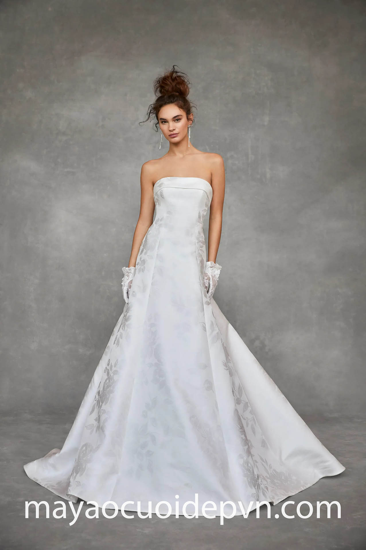 Bên cạnh những lựa chọn phổ biến, các chất liệu vải gấm brocade có bề mặt hoa lá ẩn hiện lấp loáng, hay vải jacquard dập nổi hoạ tiết,… hiện đang là lựa chọn rất được ưa thích từ phía các cô dâu sành điệu. Với những chất liệu vốn đã đặc sắc, việc lựa chọn phom váy tinh giản, gãy gọn sẽ giúp bạn càng thêm “ghi điểm” tinh tế trong mắt mọi quan khách.