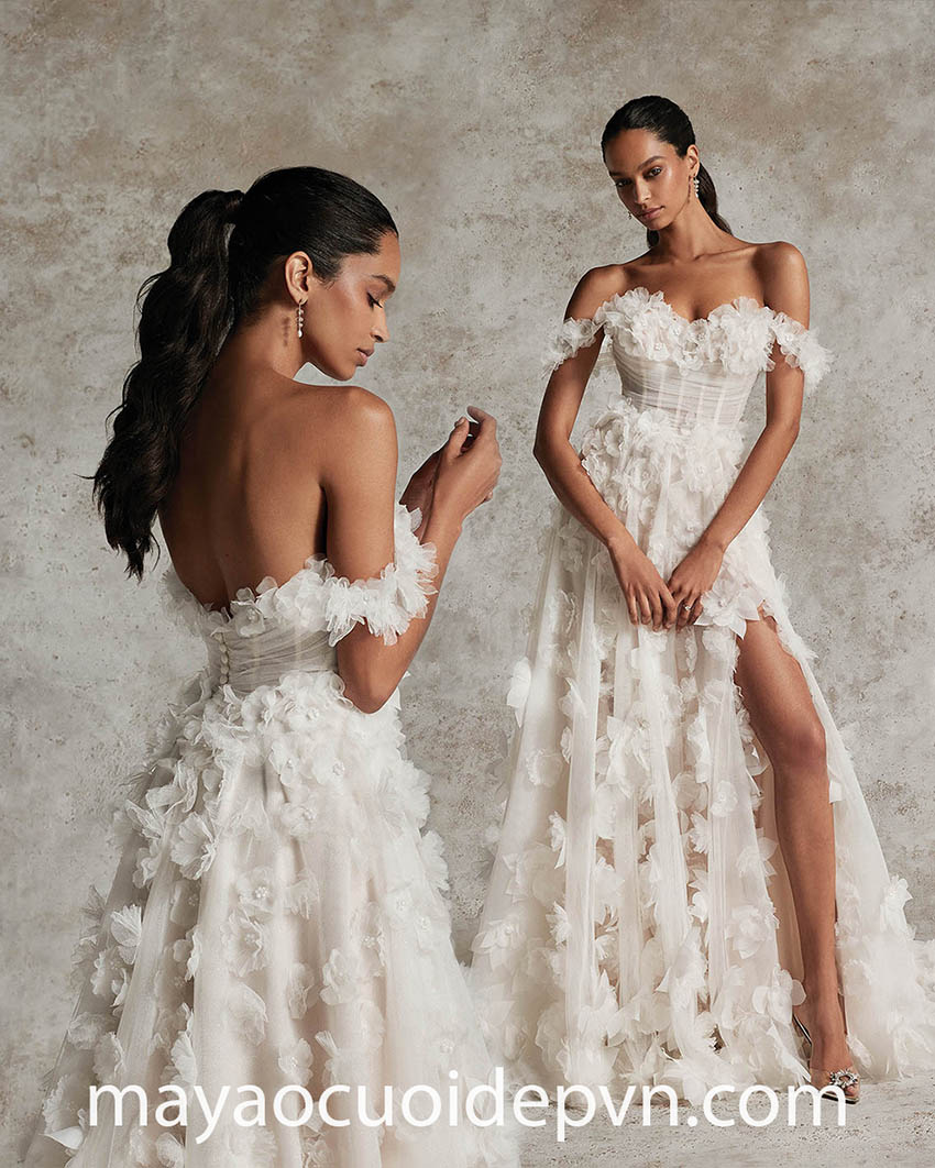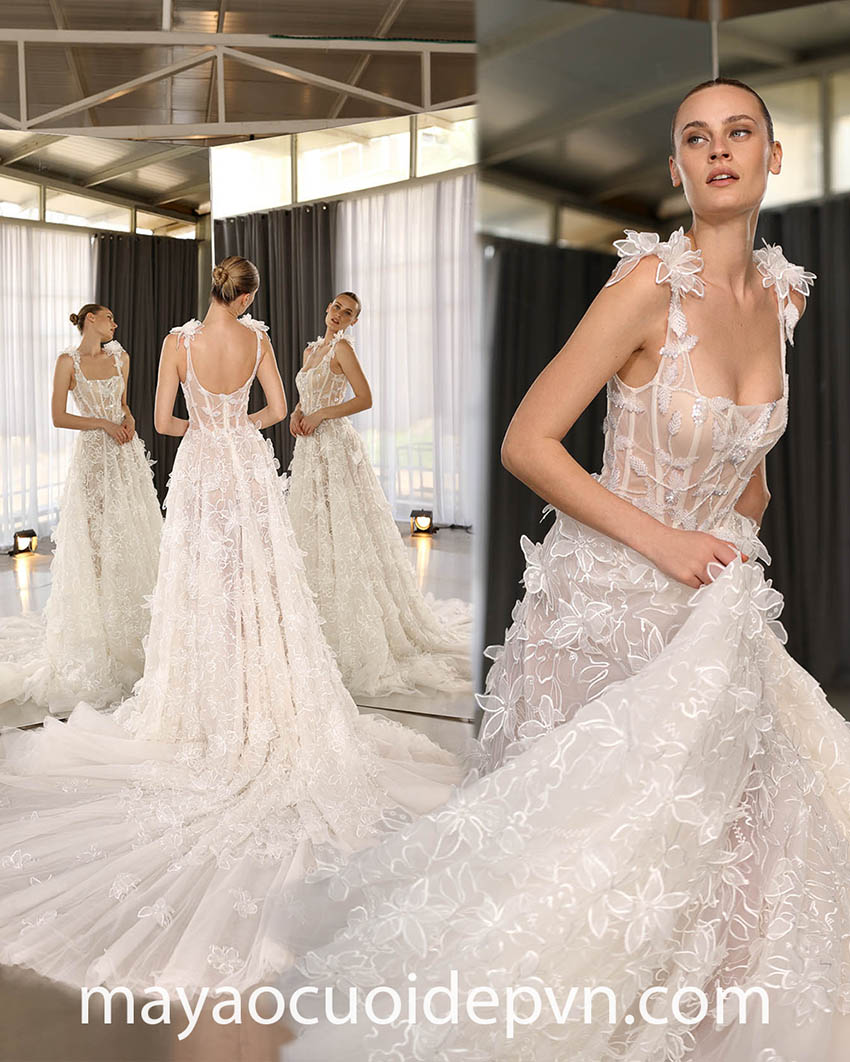 3D floral corset wedding dresses are ideal for stylish brides seeking for a gown with playful texture and romantic embellishment. The flattering visible corset will look so charming and gorgeous 3D floral appliqués unusual like nothing else you’ve ever seen before.