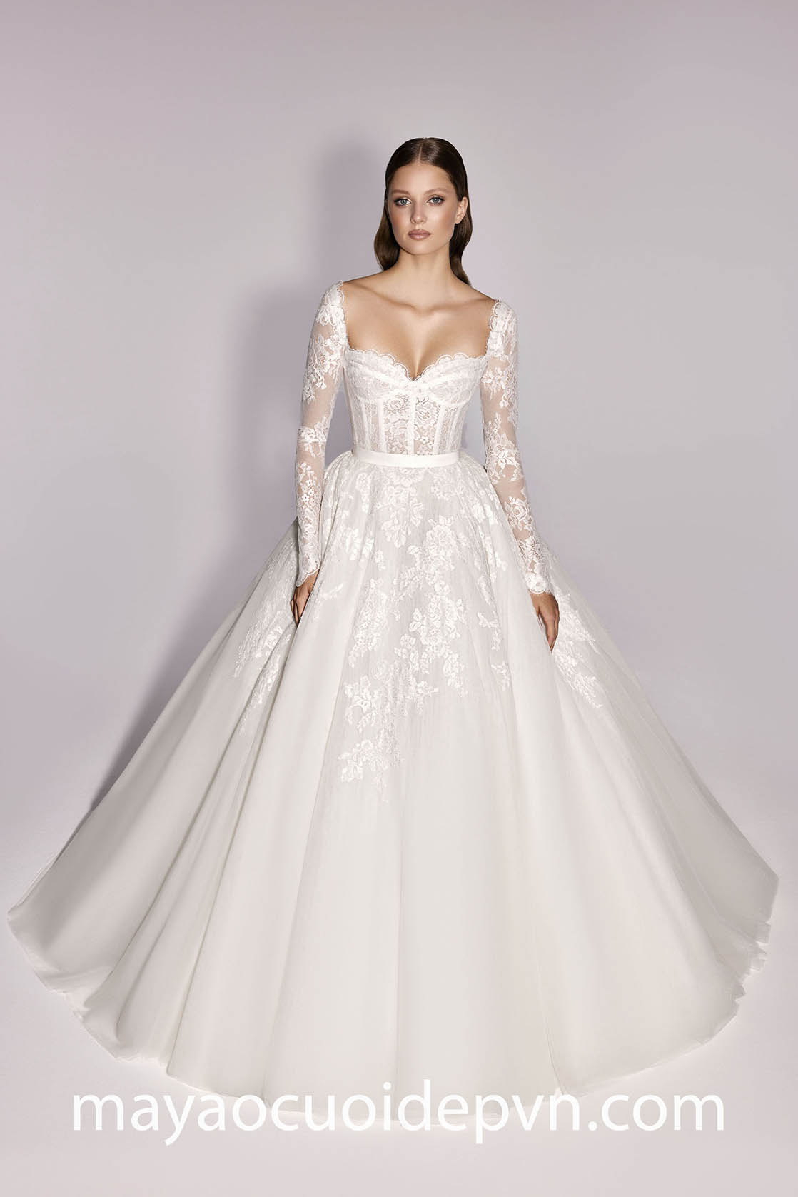 One of the most popular bridal style—the timeless chic and modest long sleeve corset wedding dress complement a variety of body types and sizes. The stunning exposed boning will enhance your curves while long sleeves add an ethereal edge to your total bridal look.
