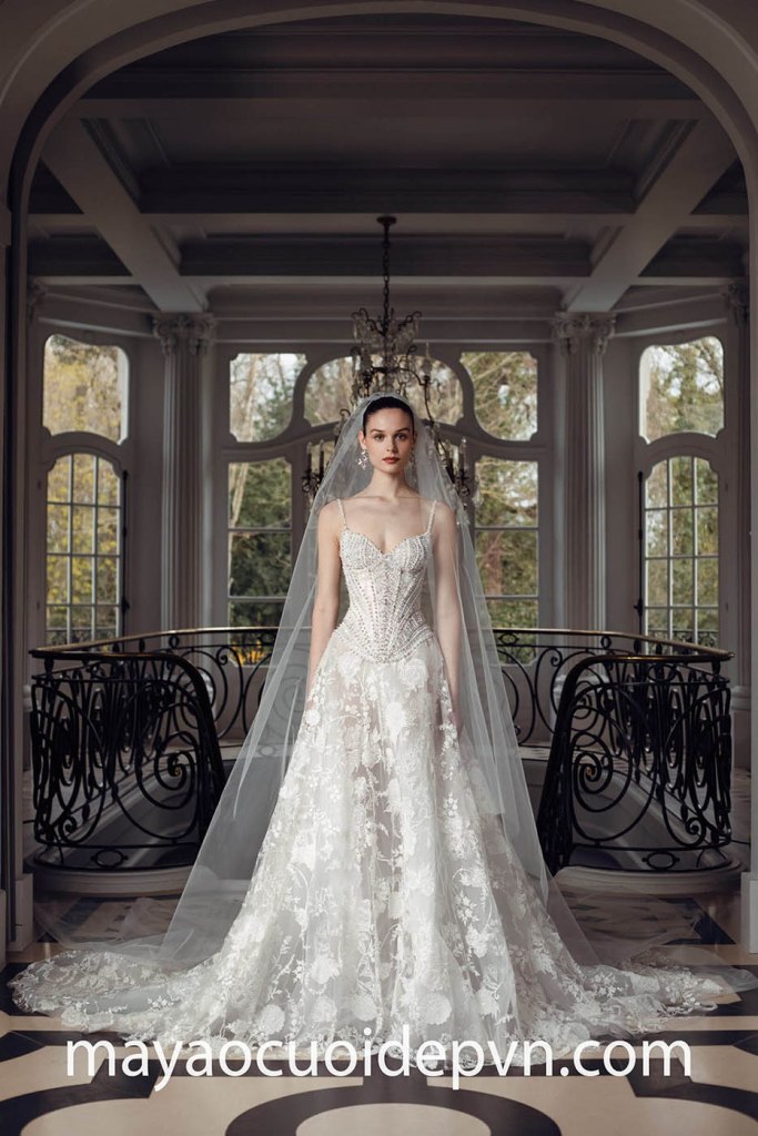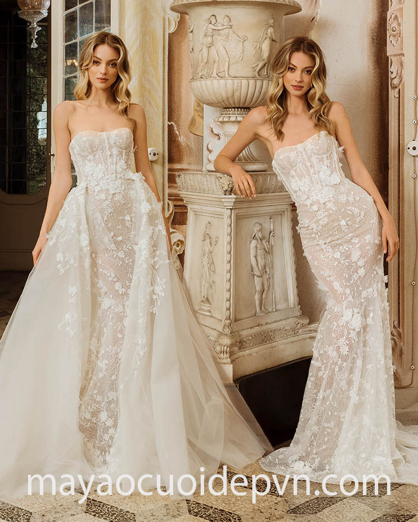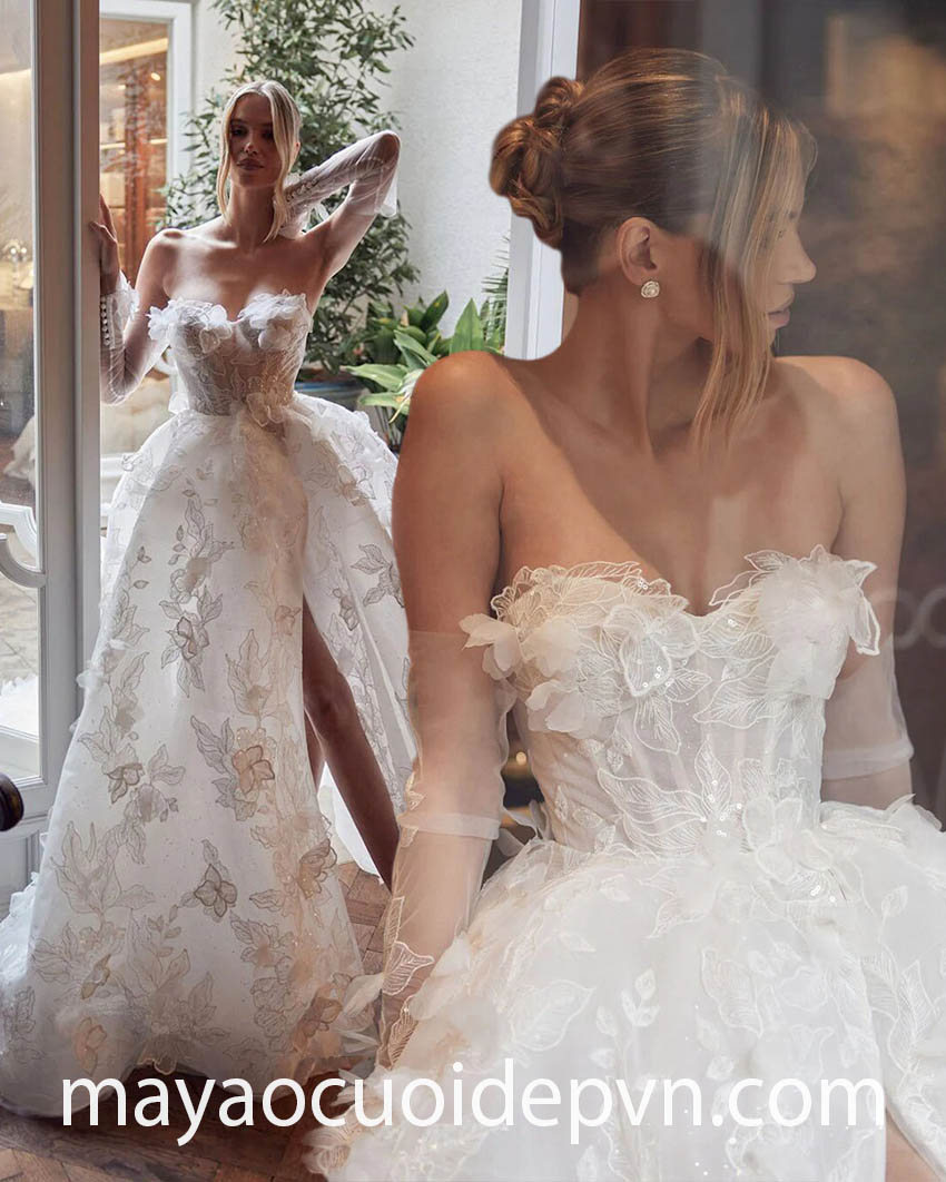 VÁY CƯỚI CORSET ĐÍNH KẾT HOA 3D SỐNG ĐỘNG