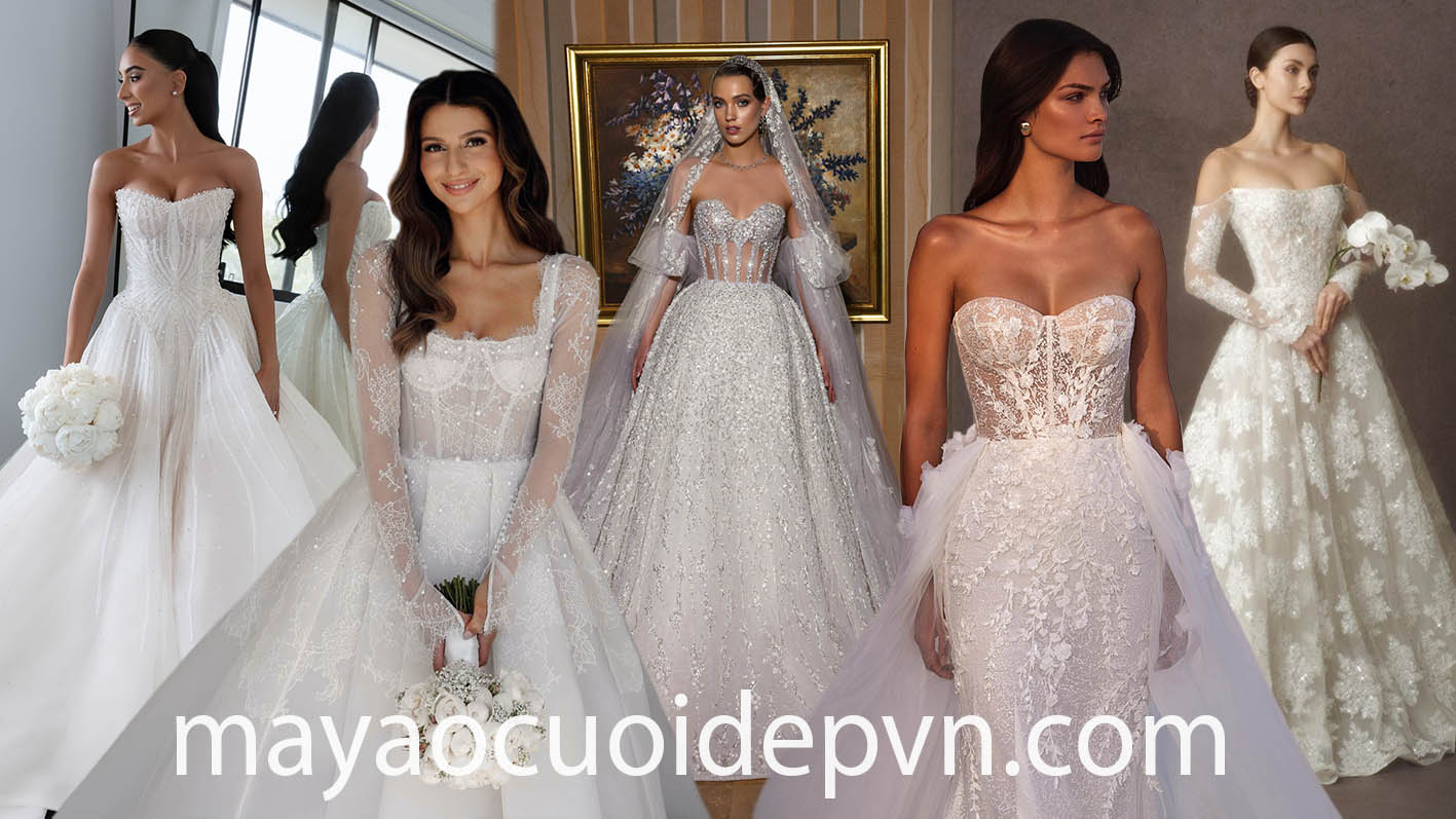 Hãy biến ngày trọng đại của bạn trở nên thực sự mê đắm với những thiết kế đầm cưới corset đính kết lấp lánh vô cùng tinh xảo. Hãy sẵn sàng thắp sáng hạnh phúc viên mãn của bạn với những bộ cánh lấp lánh, sang trọng và đầy mê hoặc có hệ thống corset lộ rõ nét giúp tôn lên hình bóng kiêu sa mà chỉ riêng bạn sở hữu.