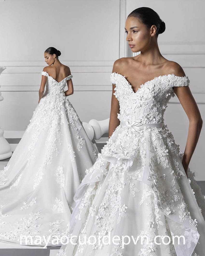 Glorious 3D floral autumn wedding gown featuring stunning silhouettes decorated with lively handmade floral appliqués will make your head go round with its beauty. Every romantic vibe you may imagine while thinking about the perfect fall wedding dress – all of it is right here in this delicate bridal style.
