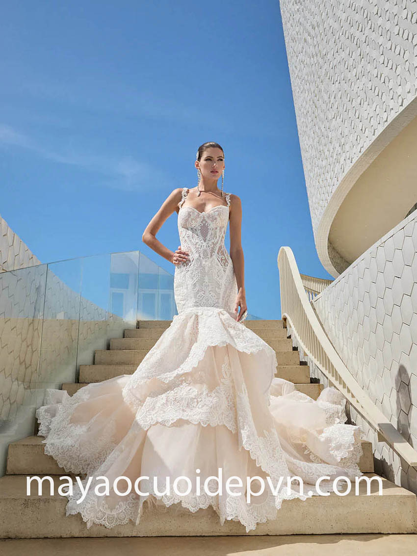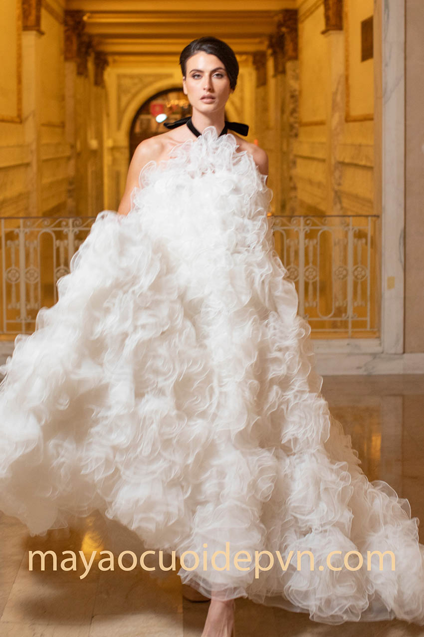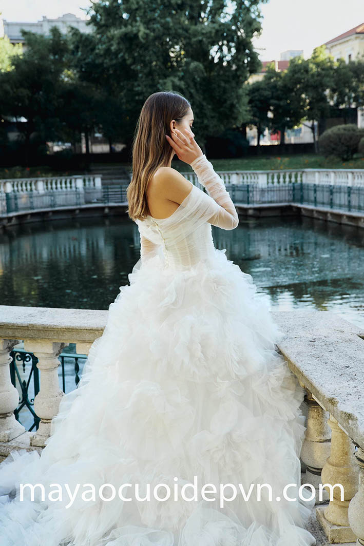 Voluminous ruffles, romantic tiers are making a big comeback in Bridal Fall 2025. Ruffled wedding dresses and tiered bridal gowns add extra drama and they are perfect for a bride looking to make a sophisticated statement.