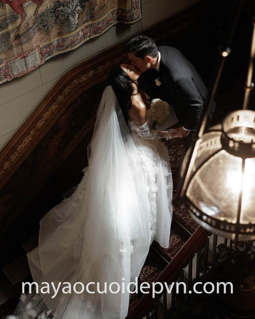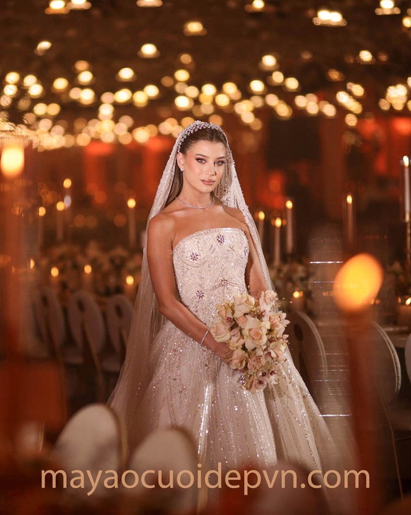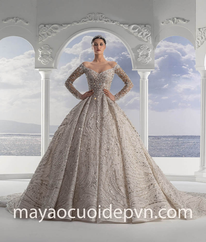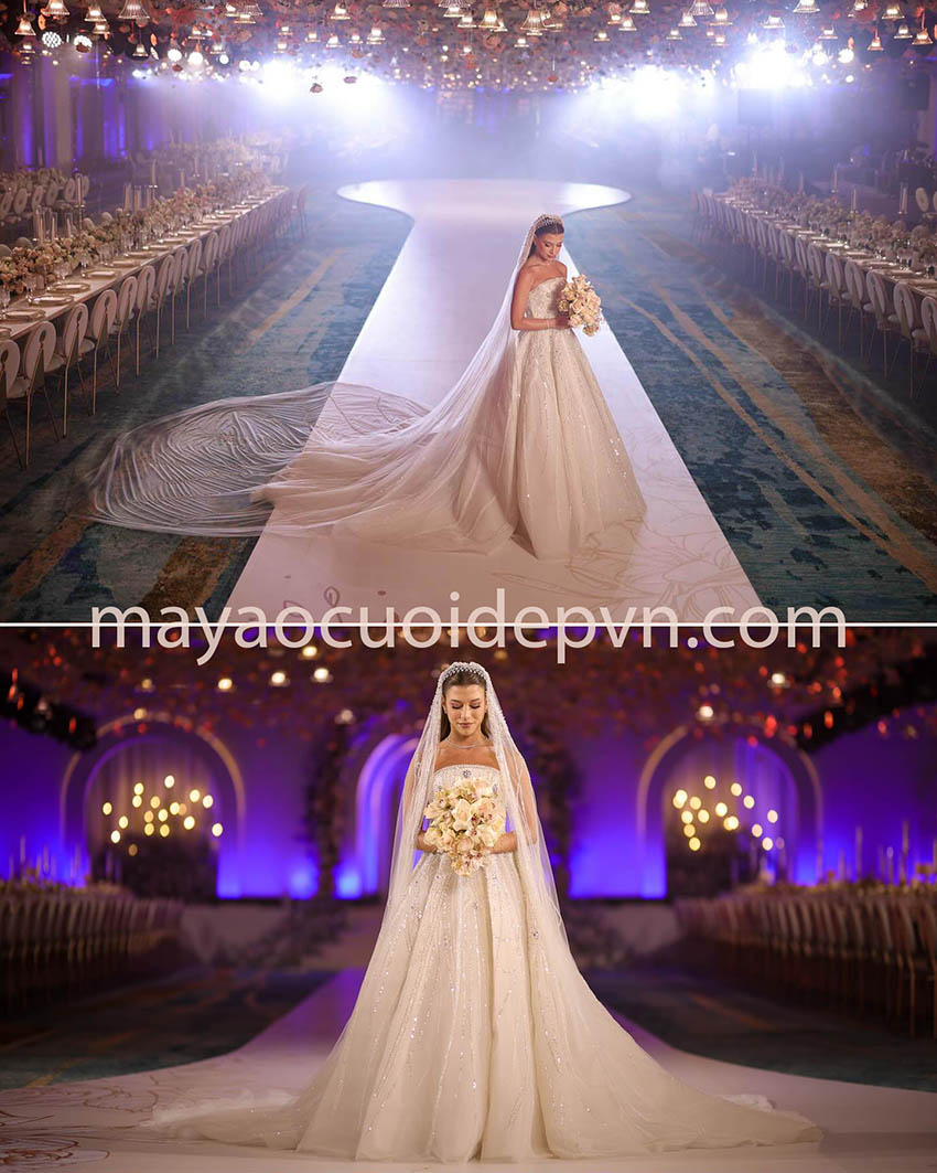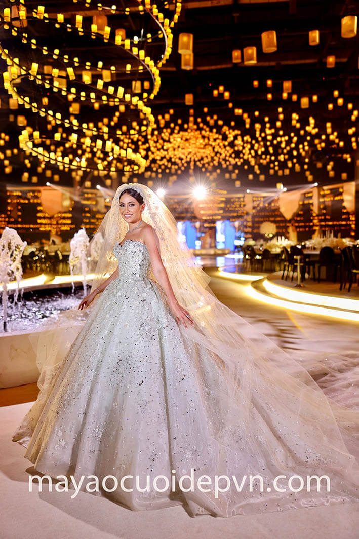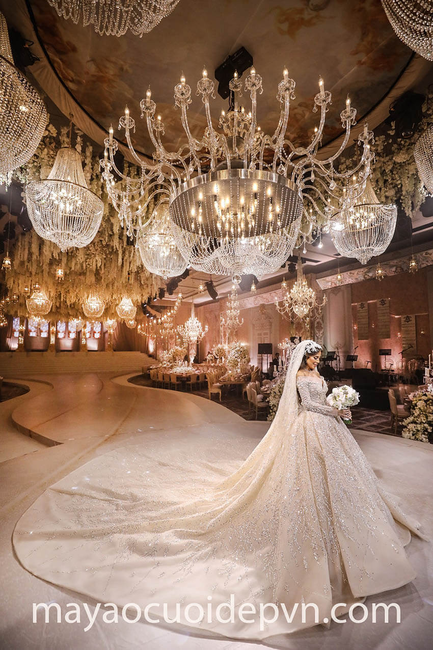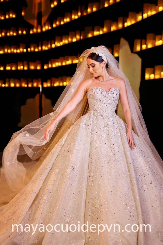 Nếu bạn muốn trở thành ngôi sao sáng nhất trong ngày cưới của mình, chiếc váy cưới đuôi dài nạm đá lấp lánh chính là sự lựa chọn hoàn hảo. Những viên đá quý phản chiếu ánh sáng, tạo nên một vẻ đẹp đầy mê hoặc, lấp lánh như những vì sao trên bầu trời đêm. Váy cưới này không chỉ thu hút ánh nhìn mà còn mang đến cho bạn cảm giác như một Nữ thần rực rỡ trong ánh sáng của tình yêu.