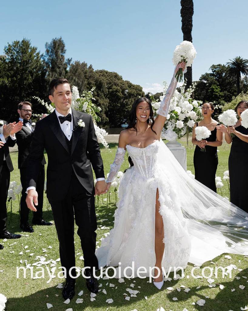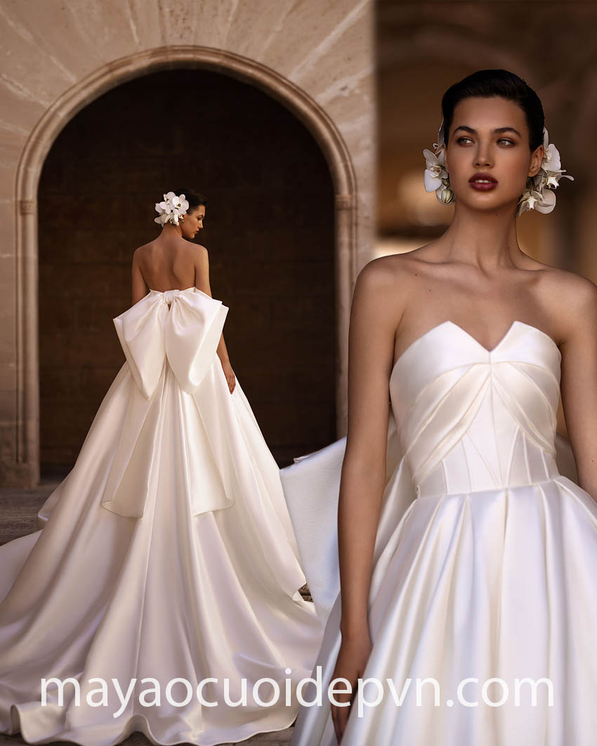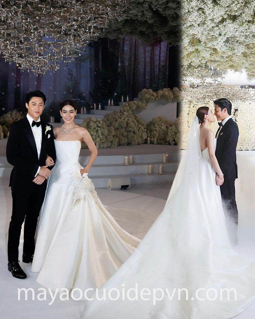 - Váy cưới đuôi dài phong cách ấn tượng – Một chiếc váy như bước ra từ những bộ phim lãng mạn, nổi bật và sống động, đầy lôi cuốn.