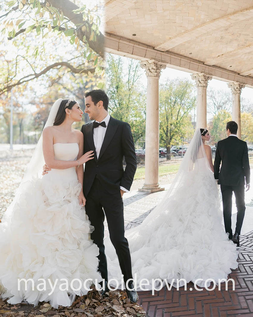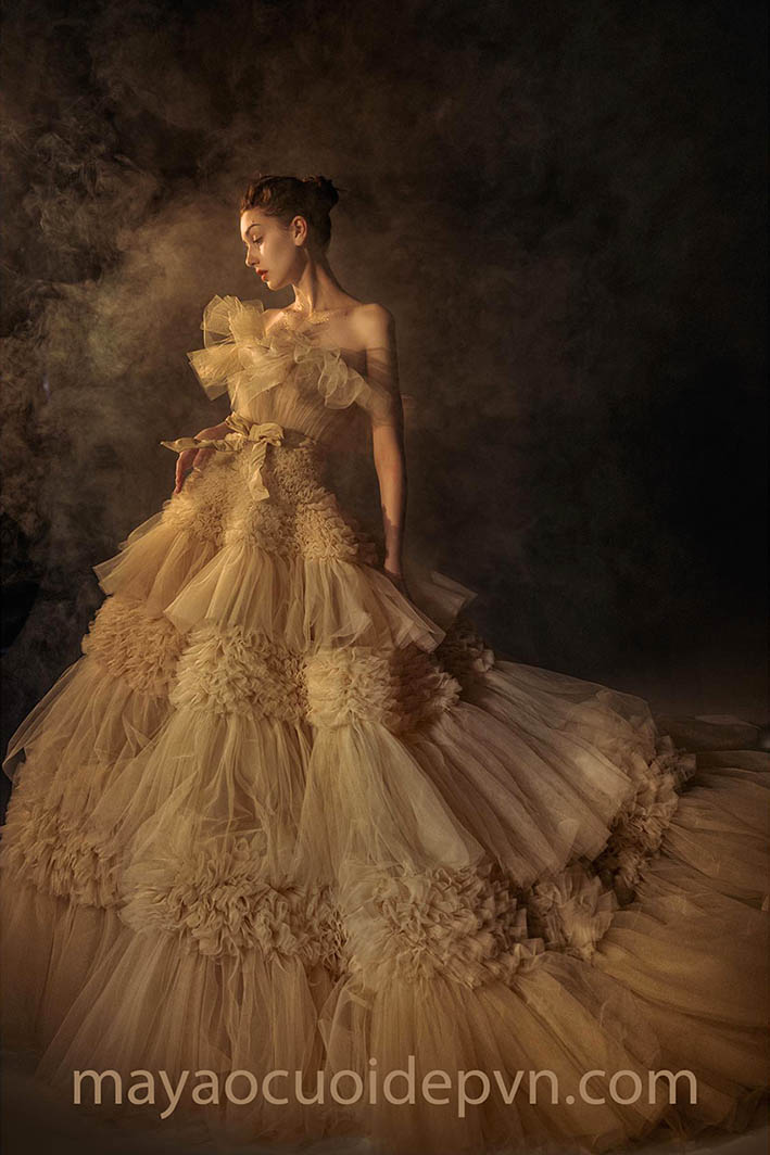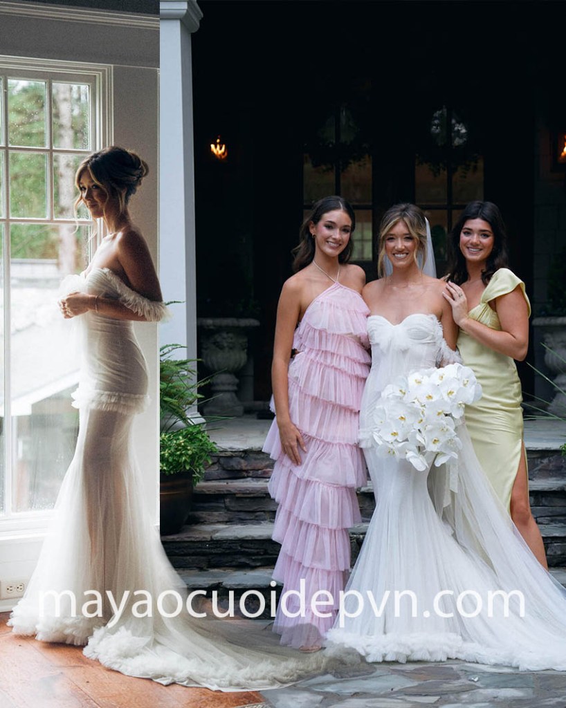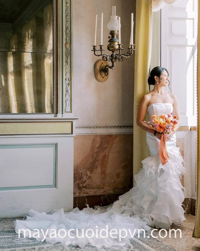 - Váy cưới đuôi xếp bèo tầng – Bồng bềnh như làn sóng, mềm mại và duyên dáng trong từng chuyển động.