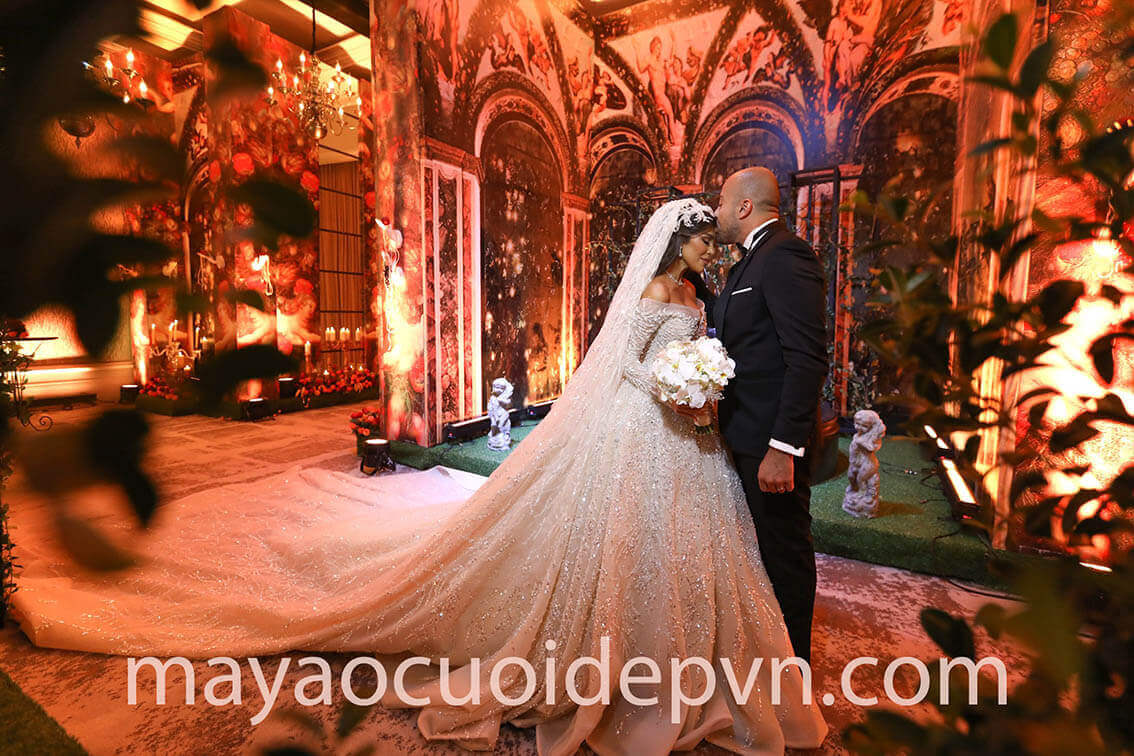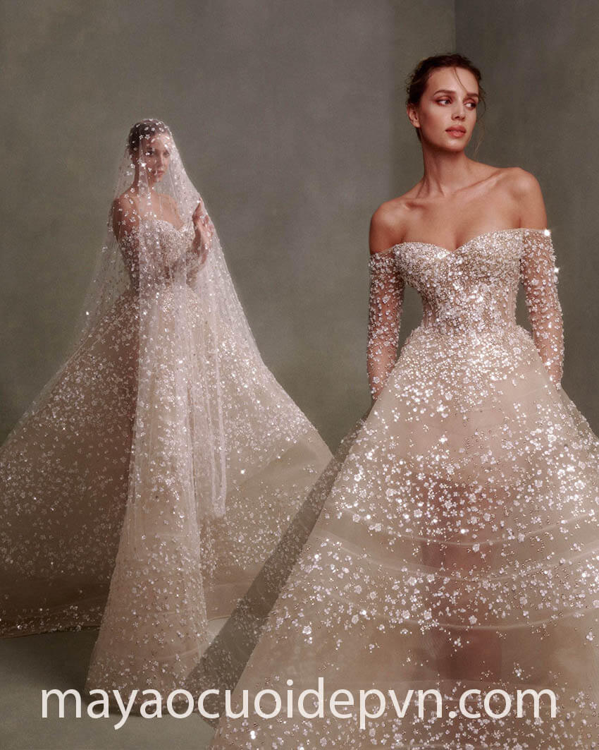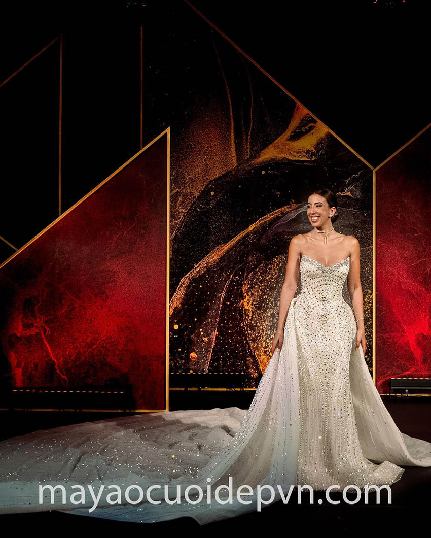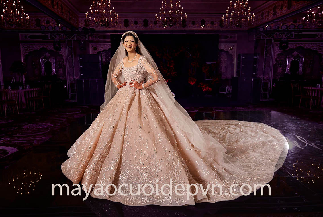 - Váy cưới đuôi dài đính kết lấp lánh – Lấp lánh như những vì sao đêm, ánh sáng phản chiếu từ từng chi tiết mang đến vẻ đẹp quyến rũ bất tận.