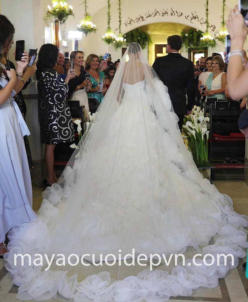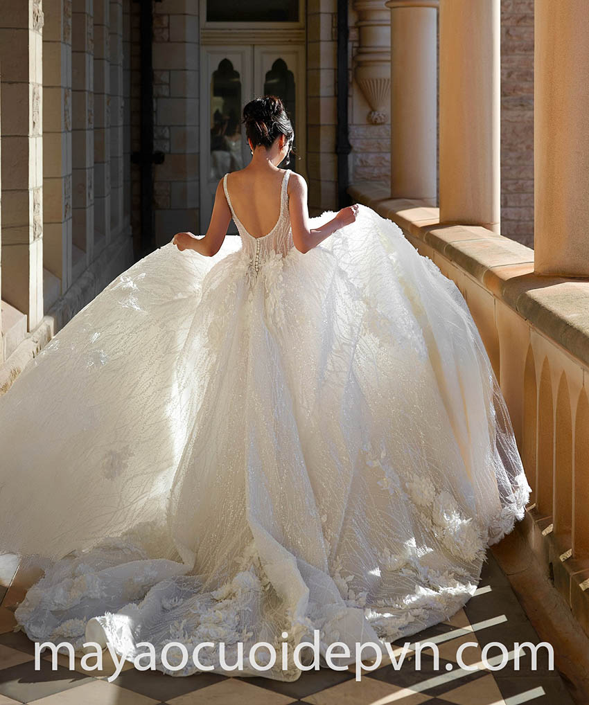 VÁY CƯỚI ĐUÔI DÀI HOA 3D LÔI CUỐN