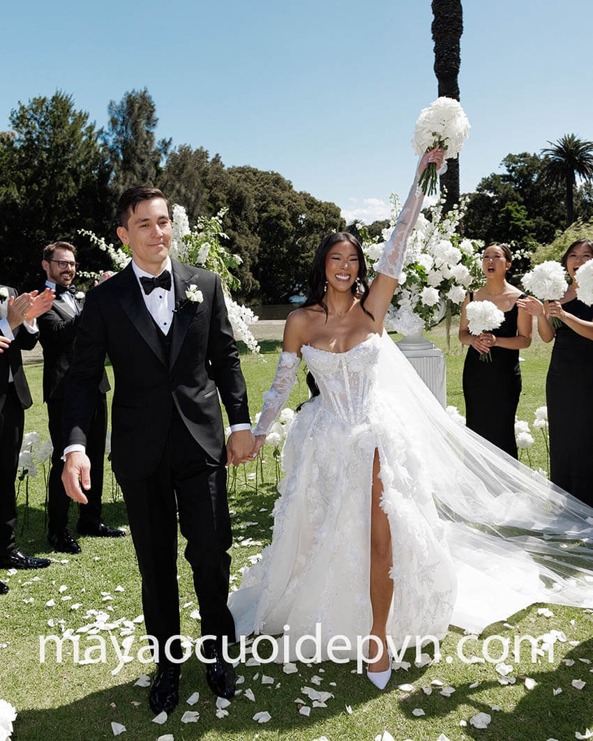 - Váy cưới đuôi dài điểm hoa 3D – Lộng lẫy như một khu vườn hoa nở rộ, mang đến vẻ đẹp đầy sắc màu và ấm áp.