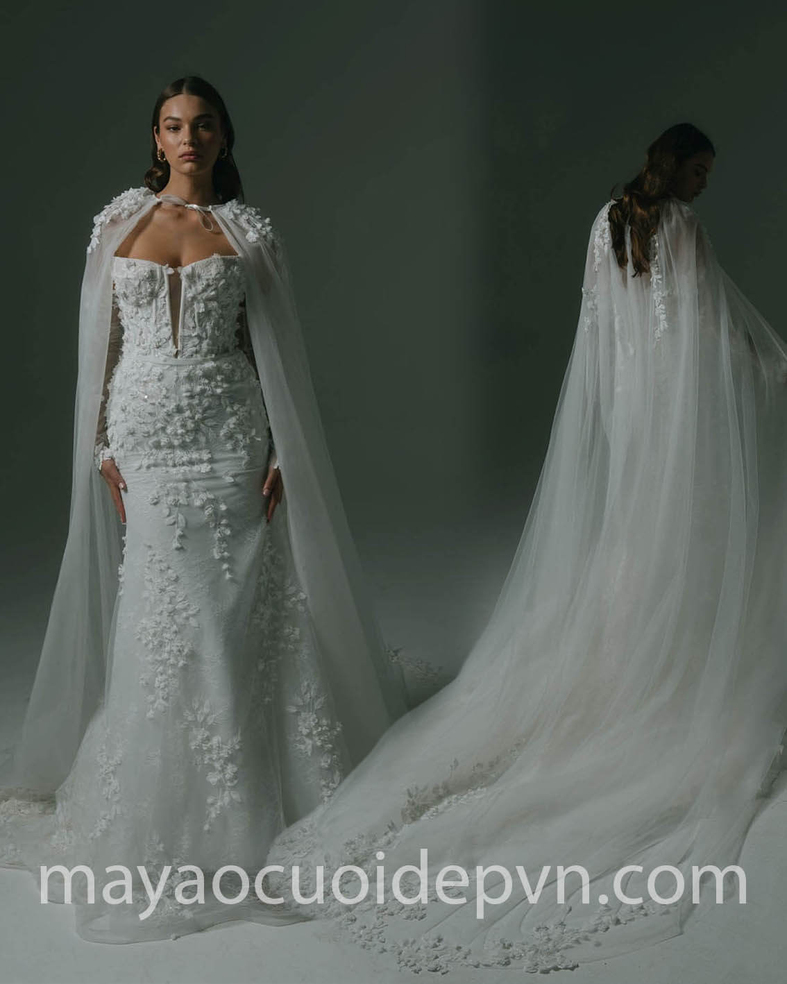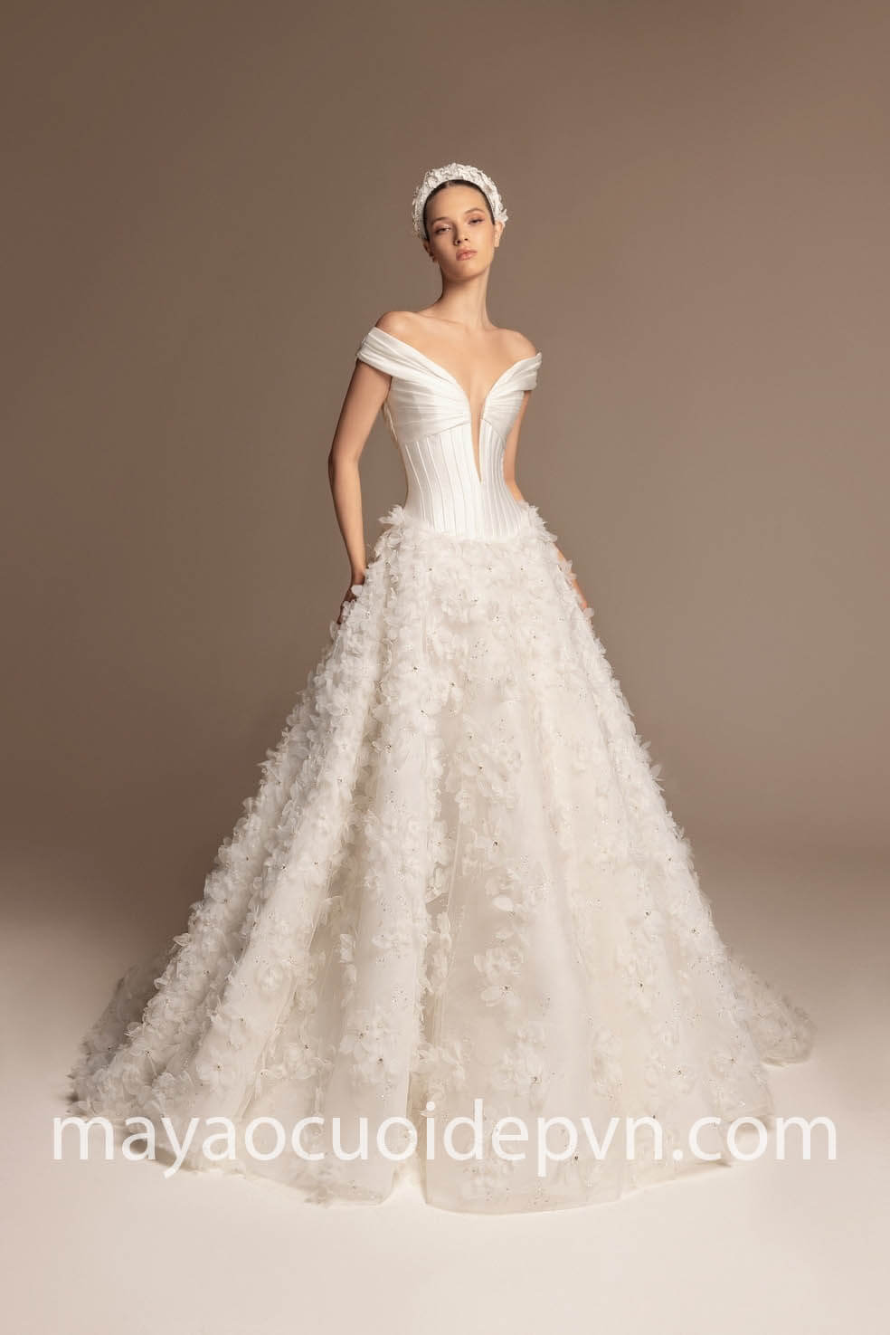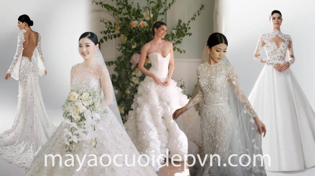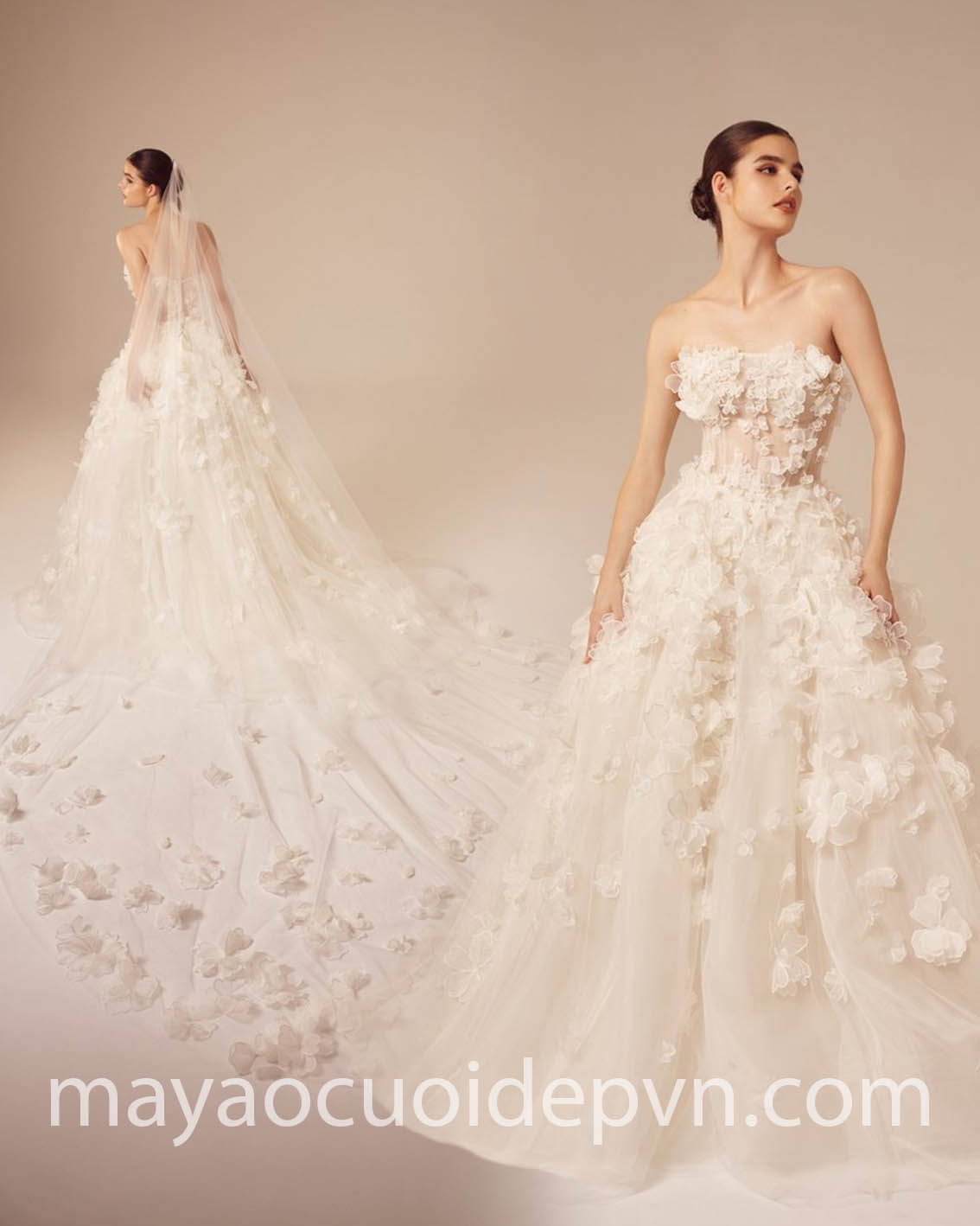 Váy cưới mùa đông là cơ hội tuyệt vời để bạn thử những chi tiết hoa 3D tinh xảo. Những họa tiết hoa này có thể lấy cảm hứng từ những bông hoa mùa đông, tuyết phủ hay những cánh hoa mỏng manh, tạo ra một vẻ đẹp huyền ảo và đầy lãng mạn. Cho dù là trên phần thân váy, tay áo hay vạt váy, những chi tiết này sẽ khiến chiếc váy của bạn trở thành một tác phẩm nghệ thuật, mang đậm chất mùa đông trong từng đường kim mũi chỉ.