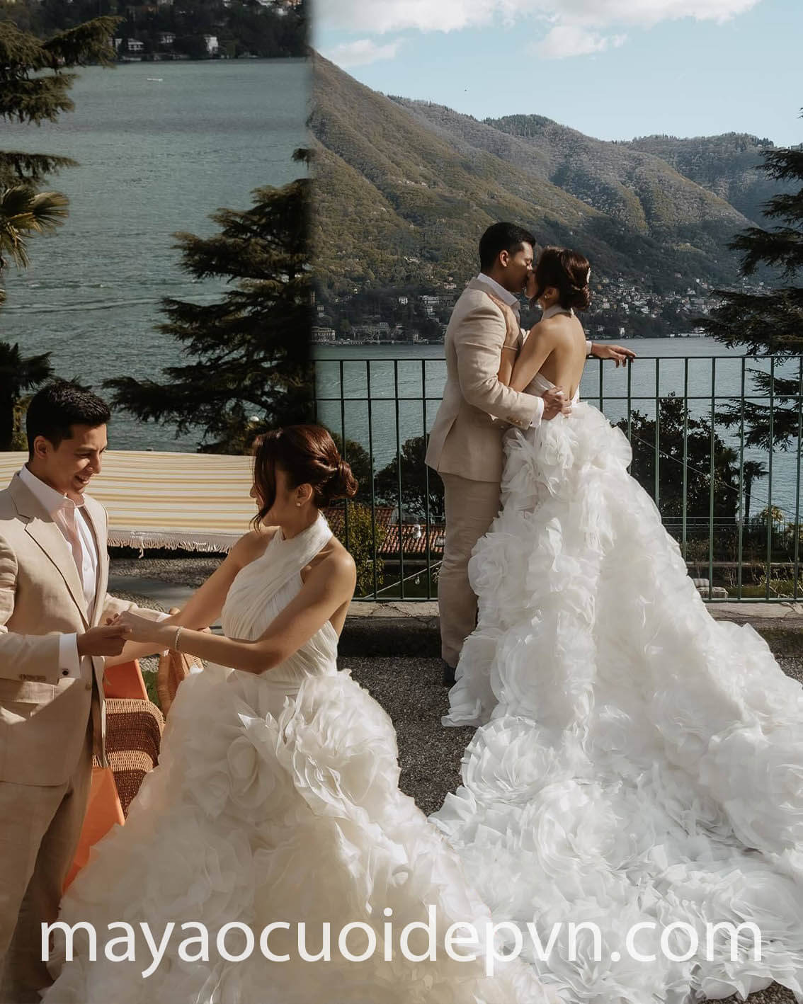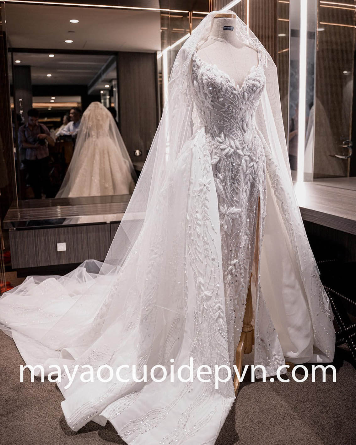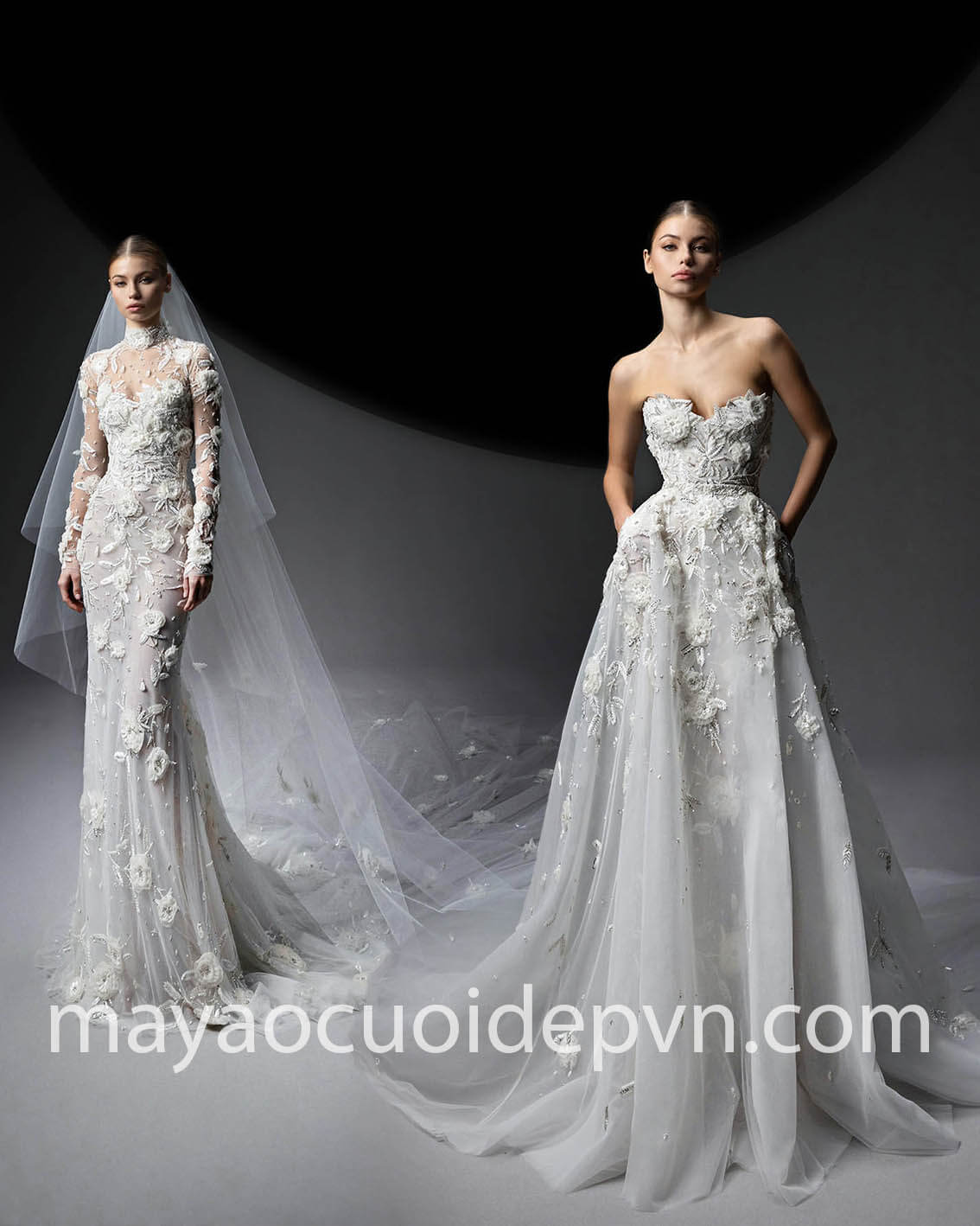 Váy cưới mùa đông là cơ hội tuyệt vời để bạn thử những chi tiết hoa 3D tinh xảo. Những họa tiết hoa này có thể lấy cảm hứng từ những bông hoa mùa đông, tuyết phủ hay những cánh hoa mỏng manh, tạo ra một vẻ đẹp huyền ảo và đầy lãng mạn. Cho dù là trên phần thân váy, tay áo hay vạt váy, những chi tiết này sẽ khiến chiếc váy của bạn trở thành một tác phẩm nghệ thuật, mang đậm chất mùa đông trong từng đường kim mũi chỉ.