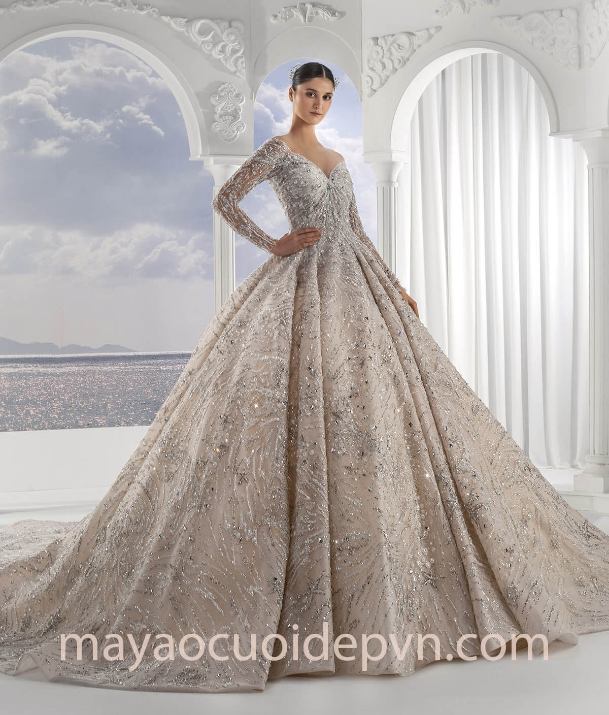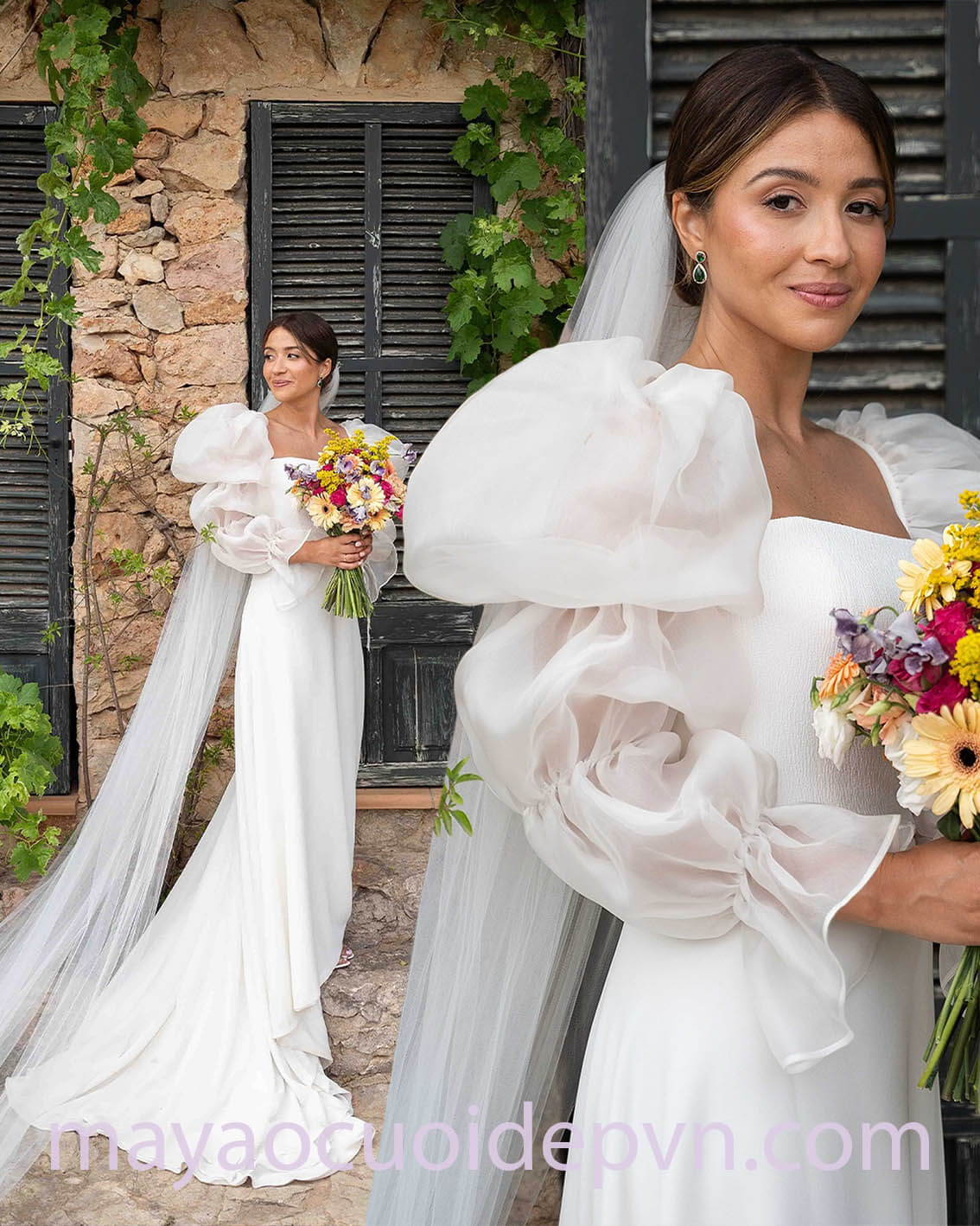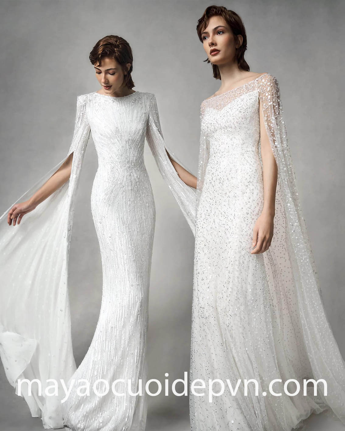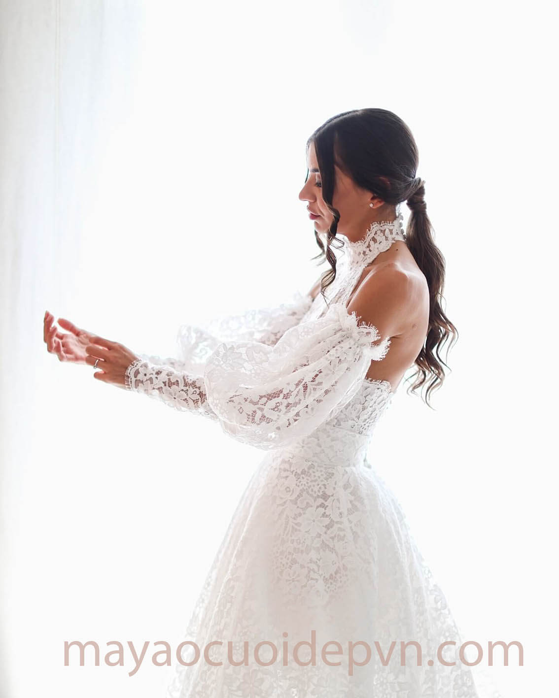 Mùa đông là dịp lý tưởng để bạn thử những mẫu áo cưới tay kiểu ấn tượng. Từ tay áo phồng, tay áo bishop đến những kiểu tay áo lệch vai, tay áo oversize sẽ làm cho bộ váy của bạn trở nên ấn tượng và đầy lôi cuốn. Còn nếu bạn yêu thích sự hiện đại, những chiếc tay áo ôm sát dún phồng trên vai với họa tiết ren hay pha lê tinh xảo sẽ mang đến một vẻ ngoài thanh lịch và sang trọng.