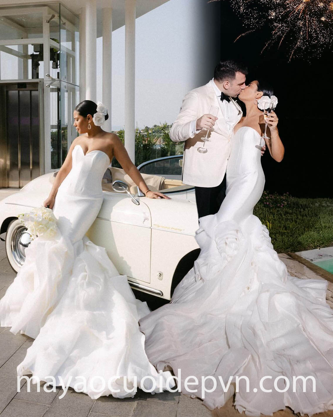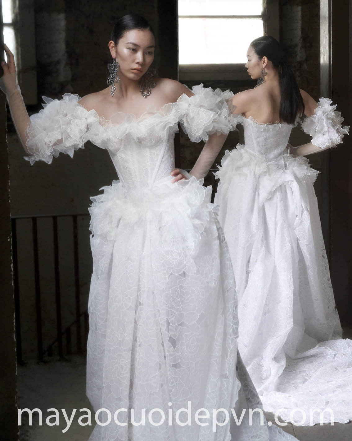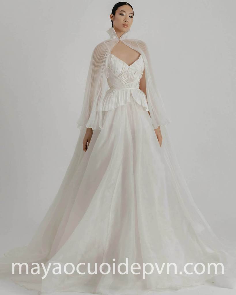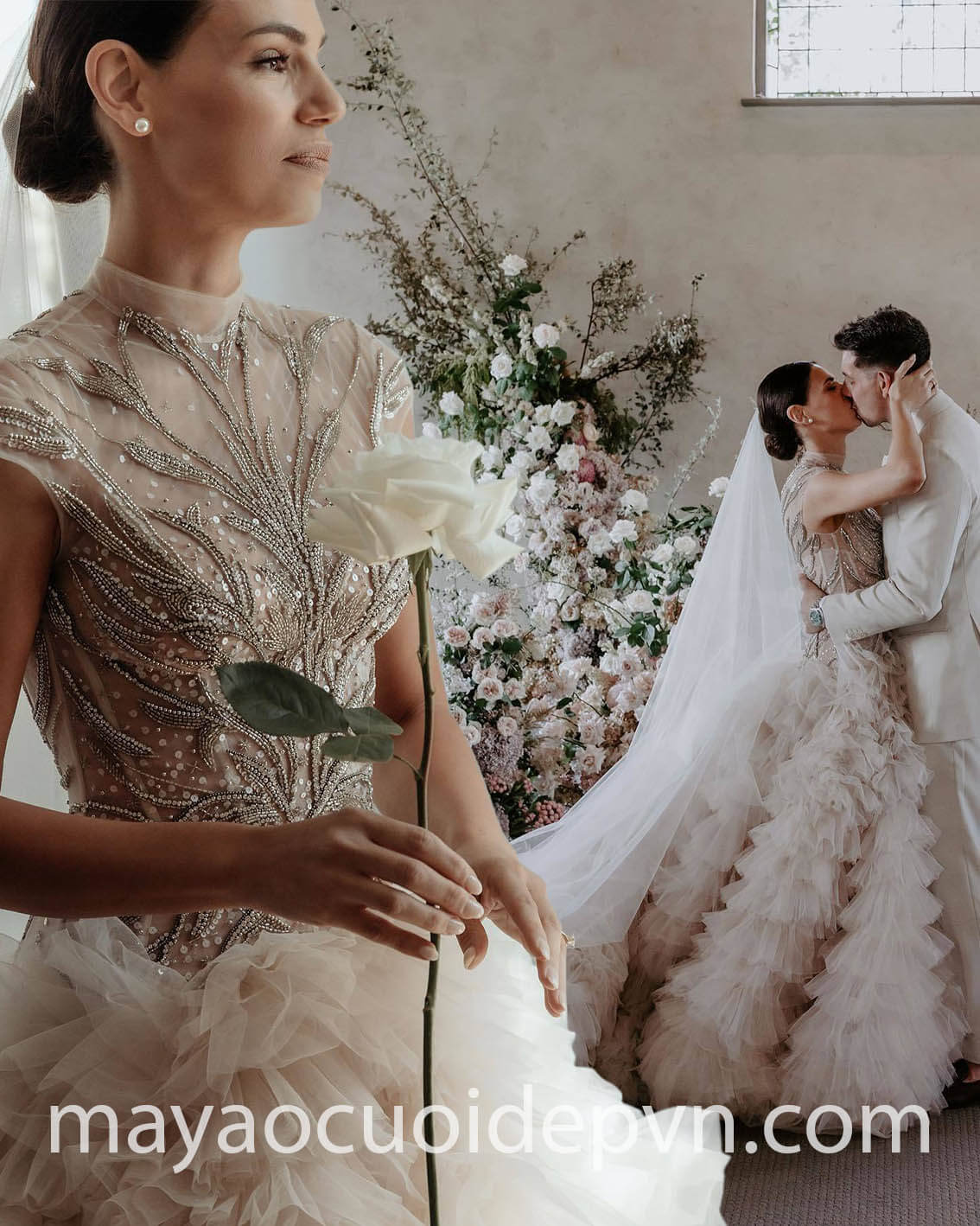 Nếu bạn yêu thích một chiếc váy cưới bồng bềnh mơ mộng, hãy thử những mẫu váy cưới mùa đông xếp bèo tầng. Những chi tiết bèo tầng không chỉ tạo sự chuyển động mềm mại mà còn giúp bộ cánh trở nên đầy lãng mạn và huyền bí. Từng lớp vải mỏng manh như lưới hay voan organza bắt sáng cực kỳ đẹp mắt, khiến bạn như bước ra từ một câu chuyện cổ tích mùa đông.