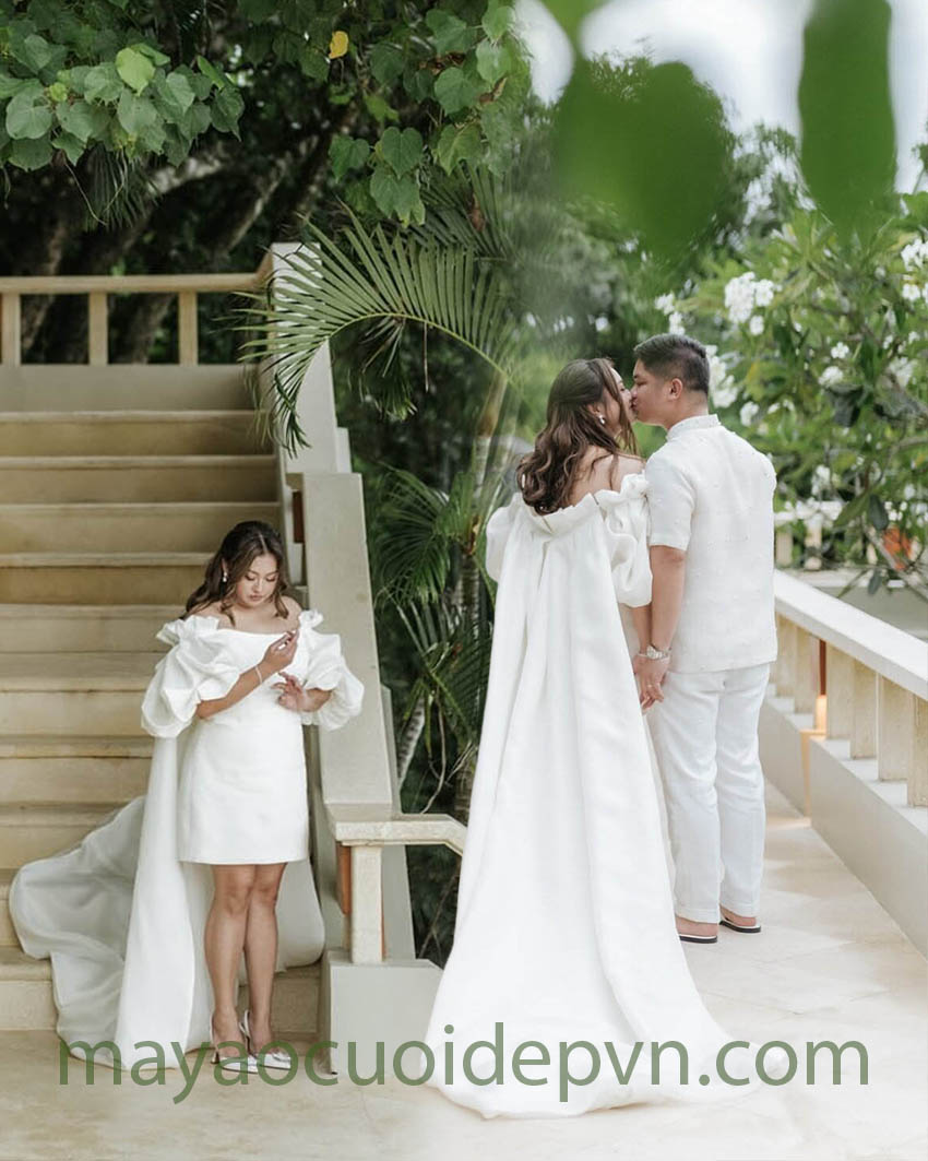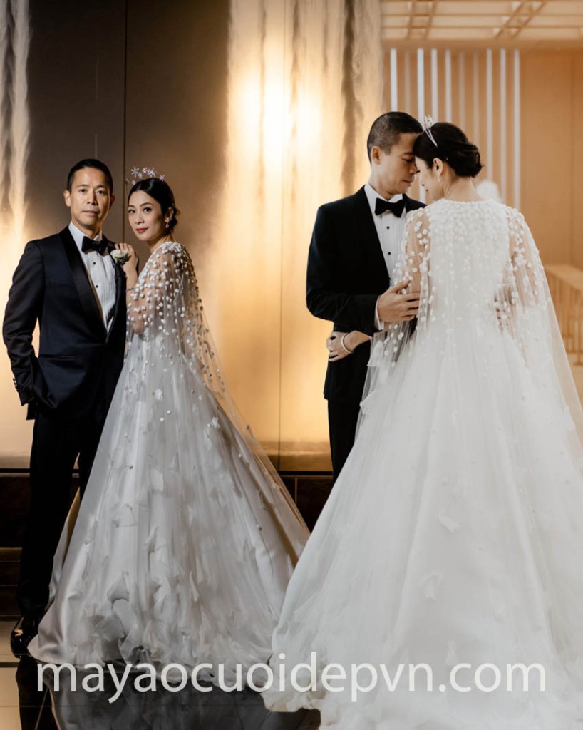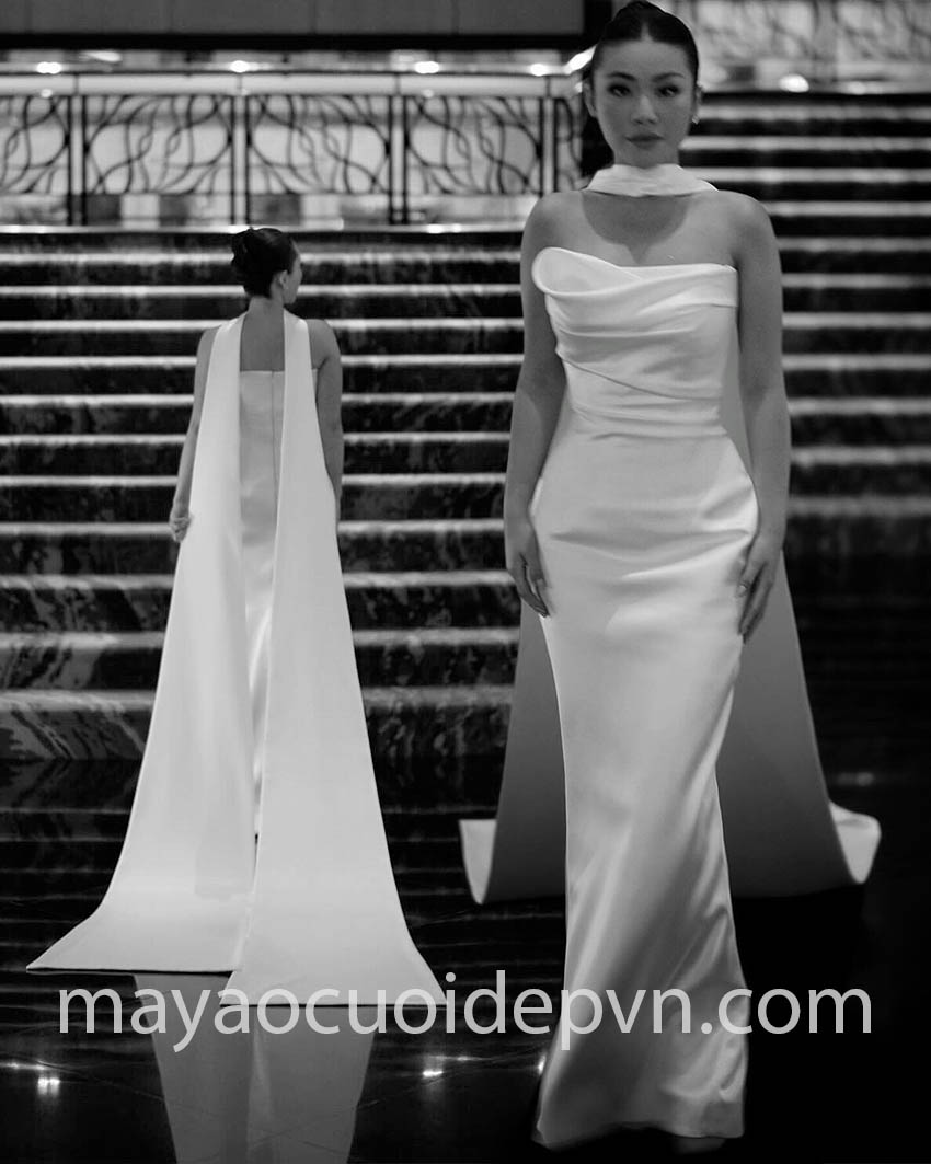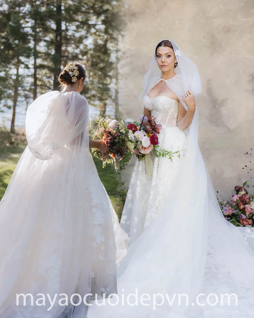 - Phù hợp với mọi phong cách – Từ lụa satin bóng bẩy đến ren thêu cầu kỳ, từ đường nét tối giản đến họa tiết xa hoa – áo choàng váy cưới có thể biến hóa theo bất cứ hình ảnh cô dâu nào mà bạn muốn.