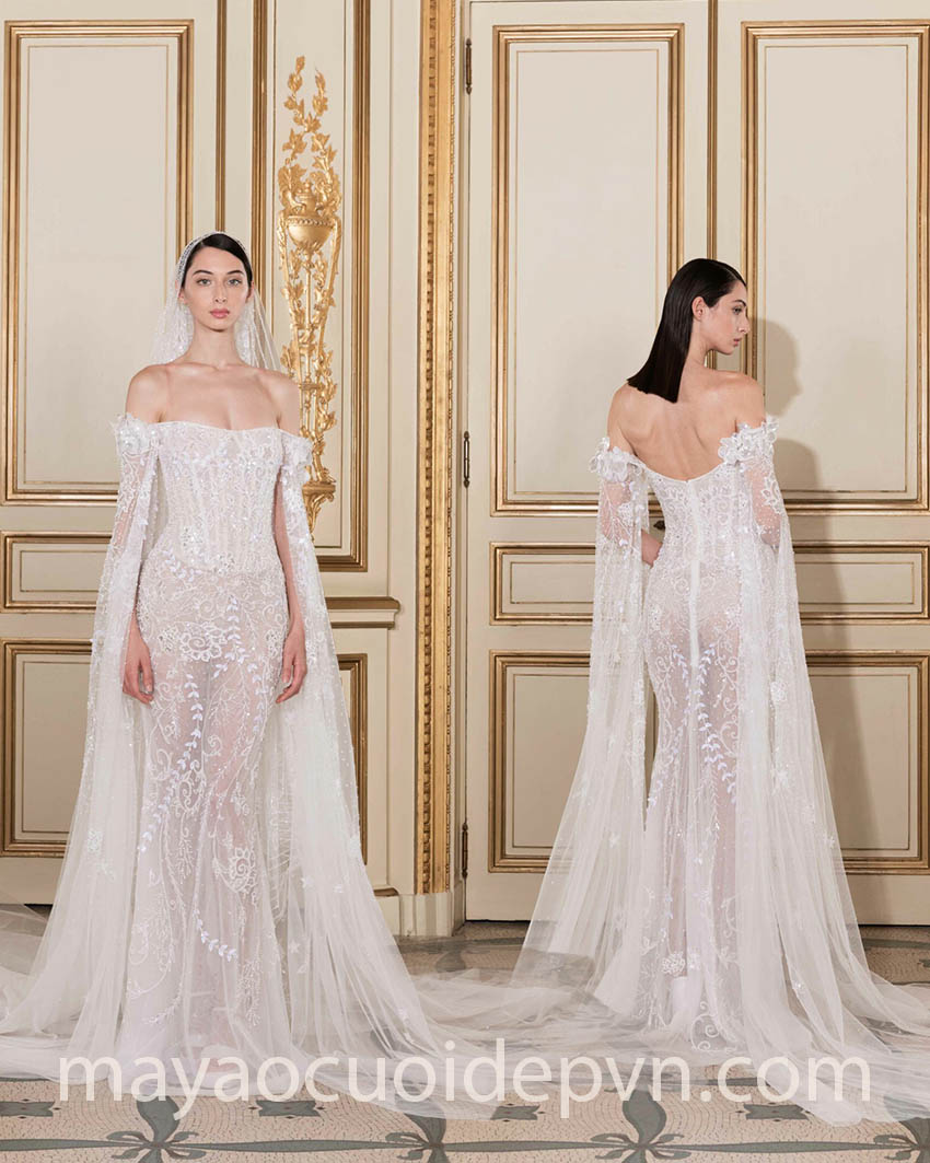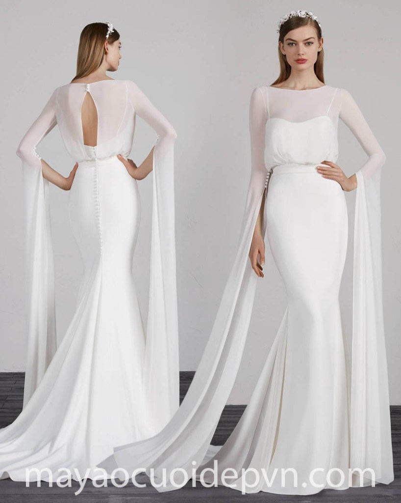 VÁY CƯỚI CAPE PHONG CÁCH TỐI GIẢN – Đường cắt sắc nét, thanh lịch tối giản, tinh tế đến từng chi tiết. Dành cho cô dâu yêu phong cách đương đại vượt thời gian.
