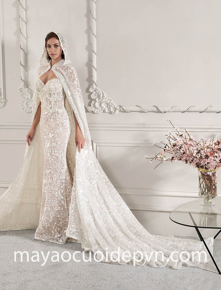 VÁY CƯỚI PHỐI ÁO CHOÀNG CÓ MŨ TRÙM ĐẦU – Một chút huyền bí, một chút cổ tích, giúp bạn hóa thân thành nàng công chúa bước ra từ giấc mơ. Lựa chọn hoàn hảo cho các đám cưới mùa thu đông.