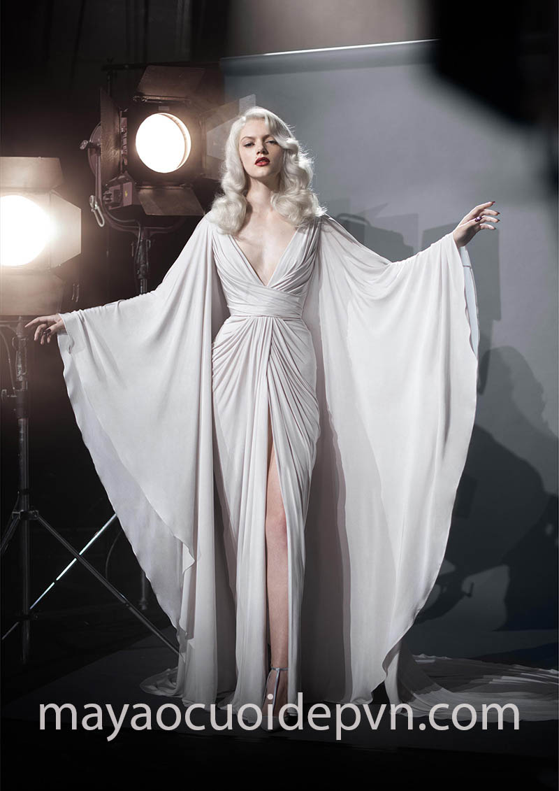 VÁY CƯỚI CAPE PHONG CÁCH ẤN TƯỢNG – Thiết kế cầu kỳ, chất liệu xa hoa, những đường cắt sắc sảo. Hoàn hảo cho cô dâu yêu phong cách vương giả khiến ai cũng phải trầm trồ khen ngợi.