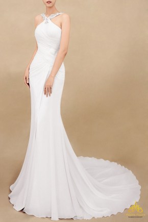 ÁO CƯỚI ĐUÔI CÁ LỤA CREPE CỔ YẾM PHONG CÁCH TỐI GIẢN MINIMALIST. MàKH3929