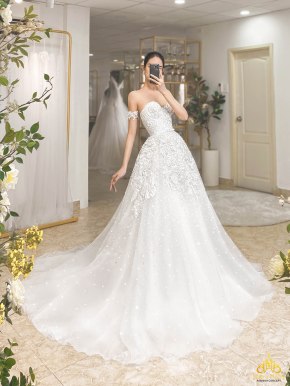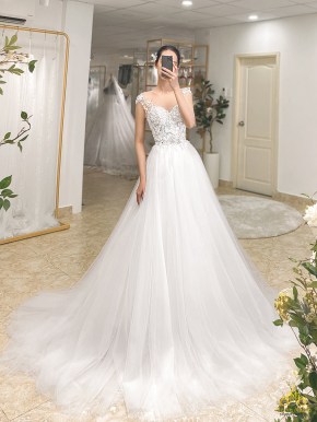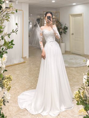 ÁO CƯỚI CHỮ A LỤA SUÔN NHẸ TRỄ VAI TAY DÀI ĐÍNH REN. MÃ MM4076