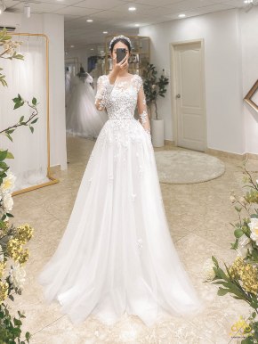 ÁO CƯỚI CHỮ A TAY DÀI PHỐI REN THANH LỊCH. MÃ MM4055